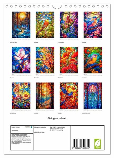 QUALITÄT - Hochwertiger Fotokalender mit 12 wunderschönen Motiven auf lichtbeständigem Bilderdruckpapier, robuste Spiralbindung mit Aufhängebügel.NACHHALTIG - deutliche Abfallreduzierung durch bedarfsgerechte Einzelstückfertigung, umweltfreundliches FSC-zertifiziertes Papier, Produktion in Deutschland, klimabewusste Logistik.PERFEKTES GESCHENK - Kalender für Freunde und Familie, für Kinder und Erwachsene, jung und alt, zu Weihnachten, Geburtstag oder zwischendurch.VIELFALT - Bildkalender in verschiedenen Formaten, z.B. DIN A5, DIN A4, DIN A3 sowie DIN A2. Ob Naturmotiv, Gemälde oder Fotos, ideal für ein persönliches Wohlfühlambiente.Steinglasmalerei ist eine Technik der Glasgestaltung, bei der Glasstücke zusammengefügt und mit Bleifolien verbunden werden, um kunstvolle Fenster, Türen und Wandschmuck zu schaffen. von Autor(in): Steffen Gierok ; Magik Artist Design
