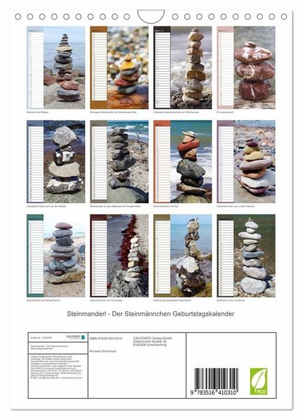 QUALITÄT - Hochwertiger Fotokalender mit 12 wunderschönen Motiven auf lichtbeständigem Bilderdruckpapier, robuste Spiralbindung mit Aufhängebügel.NACHHALTIG - deutliche Abfallreduzierung durch bedarfsgerechte Einzelstückfertigung, umweltfreundliches FSC-zertifiziertes Papier, Produktion in Deutschland, klimabewusste Logistik.PERFEKTES GESCHENK - Kalender für Freunde und Familie, für Kinder und Erwachsene, jung und alt, zu Weihnachten, Geburtstag oder zwischendurch.VIELFALT - Bildkalender in verschiedenen Formaten, z.B. DIN A5, DIN A4, DIN A3 sowie DIN A2. Ob Naturmotiv, Gemälde oder Fotos, ideal für ein persönliches Wohlfühlambiente.Steinmännchen an Fluss, See und Meer. von Autor(in): Michaela Spreider