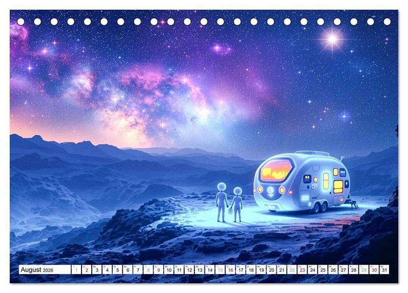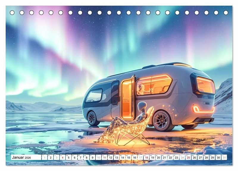 Erleben Sie mit "SternenNomaden - Futuristische Camping-Abenteuer auf fremden Welten" eine visuelle Reise durch außergewöhnliche Welten und leuchtende Landschaften. Jeder Monat zeigt faszinierende KI-generierte Campingfahrzeuge und Wohnmobile, die in einzigartigen, fremden Umgebungen ruhen: Von eisbedeckten Planeten unter tanzenden Polarlichtern über biolumineszente Dschungel und schwebende Inseln bis zu vulkanischen Heißquellen und kosmischen Winterfeiern. Begleiten Sie Aliens auf ihren Abenteuern, eingebettet in strahlende, magische Welten voller futuristischer Technologie und natürlicher Schönheit. Perfekt für Fans von Sci-Fi, Fantasy und moderner digitaler Kunst.