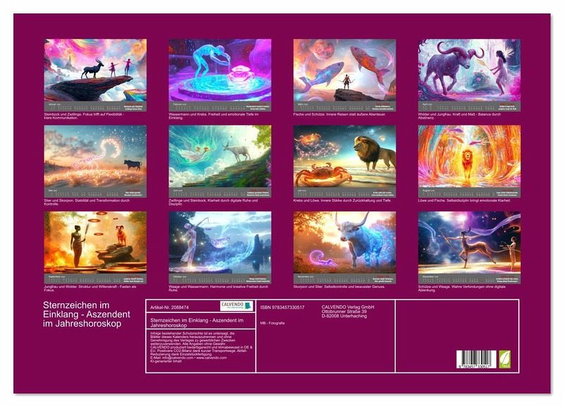 Dieser spirituelle Sternzeichenkalender verbindet Horoskop, Astrologie, Sternzeichen und Aszendent in einem inspirierenden Jahresbegleiter. Der Horoskopkalender zeigt die zwölf Tierkreiszeichen in traumhaften KI-generierten Bildwelten - astrologisch interpretiert und voller Symbolik. Ideal als Kalender für Paare, Familien oder als Astrologie Kalender zur Selbstreflexion. Ob Sternzeichen Widder, Krebs, Löwe oder Waage - dein Jahreshoroskop begleitet dich durch die Monate. Für Fans von Horoskop, Esoterik, Astro-Energie und Tierkreiszeichen. Als Familienkalender bringt er Astrologie auf neue Art…mehr