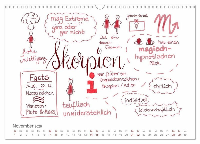 Alle 12 Sternzeichen mit ihren individuellen Eigenschaften, Planeten, Elementen, Daten und Symbolen, liebevoll skizziert von der Kritzelfee. Jeder Monat in der passenden Farbe mit den so typischen Figuren, Bildchen und Kritzeleien - mit einem Augenzwinkern, so wie Sie es von der Kritzelfee gewöhnt sind.