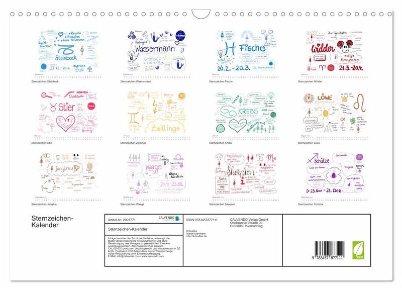 QUALITÄT - Hochwertiger Fotokalender mit 12 wunderschönen Motiven auf lichtbeständigem Bilderdruckpapier, robuste Spiralbindung mit Aufhängebügel.NACHHALTIG - deutliche Abfallreduzierung durch bedarfsgerechte Einzelstückfertigung, umweltfreundliches FSC-zertifiziertes Papier, Produktion in Deutschland, klimabewusste Logistik.PERFEKTES GESCHENK - Kalender für Freunde und Familie, für Kinder und Erwachsene, jung und alt, zu Weihnachten, Geburtstag oder zwischendurch.VIELFALT - Bildkalender in verschiedenen Formaten, z.B. DIN A5, DIN A4, DIN A3 sowie DIN A2. Ob Naturmotiv, Gemälde oder Fotos, ideal für ein persönliches Wohlfühlambiente.Alle Sternzeichen liebevoll gezeichnet von der Kritzelfee von Autor(in): Martje Kleinhans