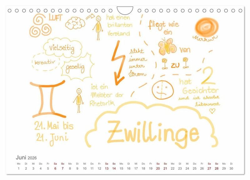 Alle 12 Sternzeichen mit ihren individuellen Eigenschaften, Planeten, Elementen, Daten und Symbolen, liebevoll skizziert von der Kritzelfee. Jeder Monat in der passenden Farbe mit den so typischen Figuren, Bildchen und Kritzeleien - mit einem Augenzwinkern, so wie Sie es von der Kritzelfee gewöhnt sind.