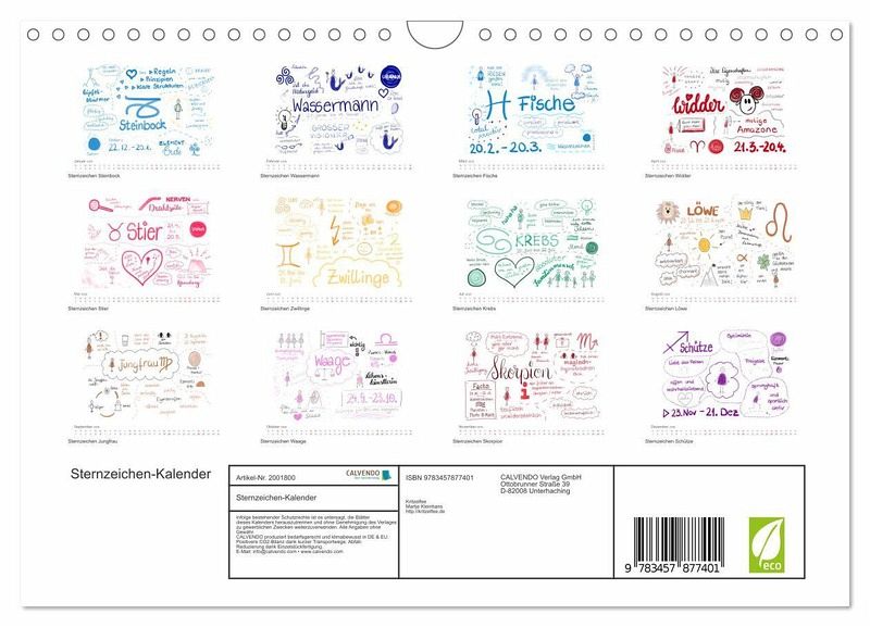 QUALITÄT - Hochwertiger Fotokalender mit 12 wunderschönen Motiven auf lichtbeständigem Bilderdruckpapier, robuste Spiralbindung mit Aufhängebügel.NACHHALTIG - deutliche Abfallreduzierung durch bedarfsgerechte Einzelstückfertigung, umweltfreundliches FSC-zertifiziertes Papier, Produktion in Deutschland, klimabewusste Logistik.PERFEKTES GESCHENK - Kalender für Freunde und Familie, für Kinder und Erwachsene, jung und alt, zu Weihnachten, Geburtstag oder zwischendurch.VIELFALT - Bildkalender in verschiedenen Formaten, z.B. DIN A5, DIN A4, DIN A3 sowie DIN A2. Ob Naturmotiv, Gemälde oder Fotos, ideal für ein persönliches Wohlfühlambiente.Alle Sternzeichen liebevoll gezeichnet von der Kritzelfee von Autor(in): Martje Kleinhans
