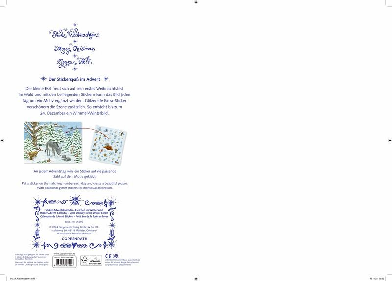 Der kleine Esel erlebt sein erstes Weihnachtsfest im Winterwald. Mit den beiliegenden Stickern kann das Bild jeden Tag um ein zauberhaftes Motiv ergänzt werden. Glitzernde Extra-Sticker verschönern die Szene zusätzlich. So entsteht bis zum 24. Dezember ein spannendes Wimmel-Winterbild. Ein kreativer Adventskalender schon für die ganz Kleinen!