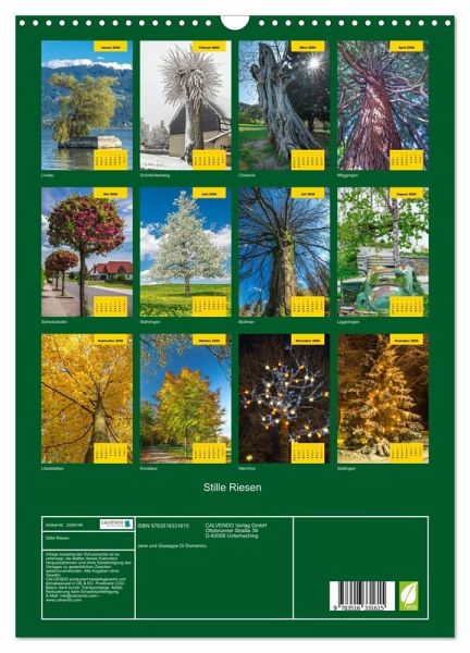 Bäume üben seit jeher eine große Faszination auf die Menschen aus. Die Fotografen Jane und Giuseppe Di Domenico zeigen in ihrem Kalender eine Auswahl stimmungsvoller Aufnahmen unterschiedlicher Bäume zum Genießen und Träumen.