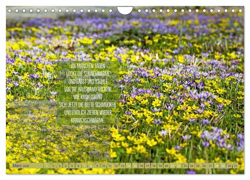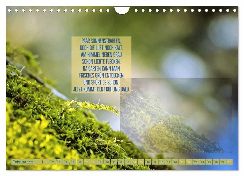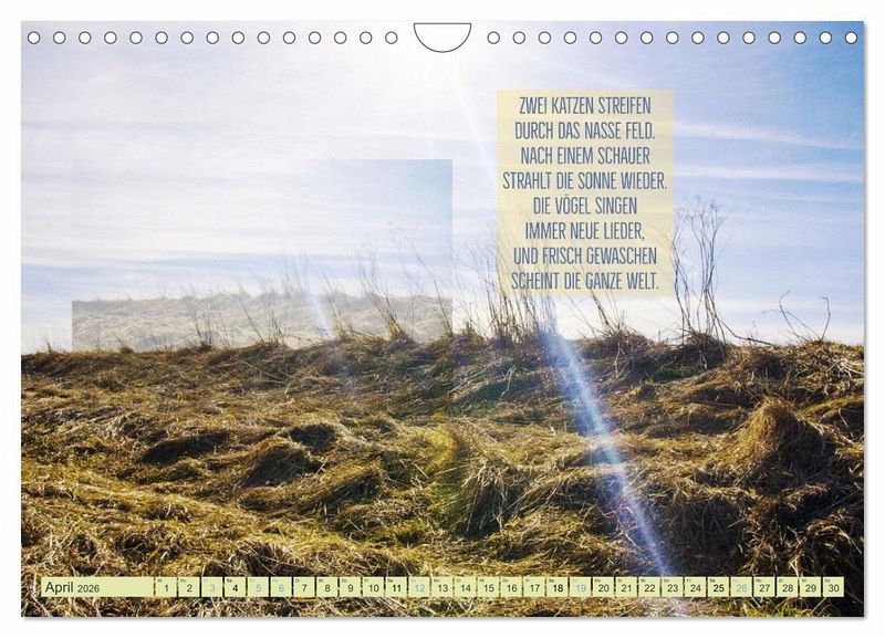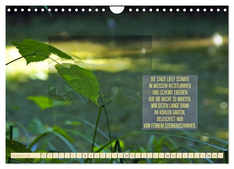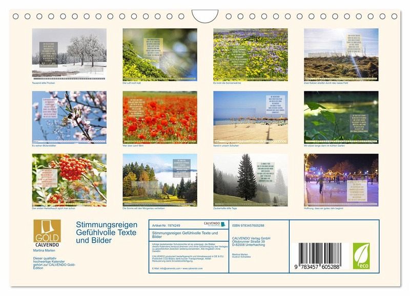Jeder Monat entfaltet seine ganz eigene Stimmung. Die leicht verfremdeten Landschaftsaufnahmen in Verbindung mit jeweils sorgfältig darauf abgestimmten Gedichten führen dazu, sich emotional in jeden Monat und jede Jahreszeit einfühlen zu können.