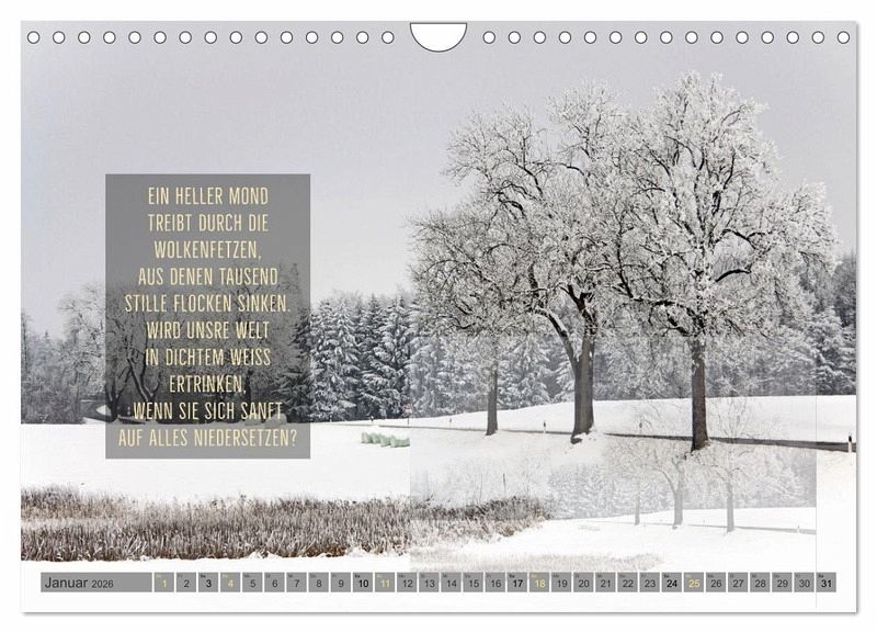Die leicht verfremdeten Landschaftsaufnahmen in Verbindung mit jeweils sorgfältig darauf abgestimmten Gedichten führen dazu, sich emotional in jeden Monat und jede Jahreszeit einfühlen zu können.