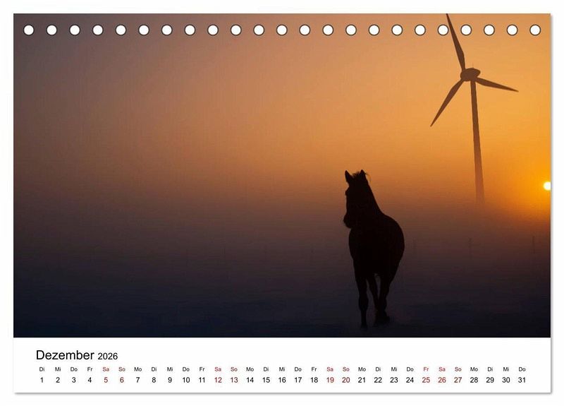 Dezember: Nebeliger Sonnenuntergang mit Pferden in Kengen