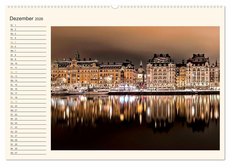 Stockholms offizieller Besucherguide, Visitstockholm.com, beschreibt die bezaubernde schwedische Stadt so: "Moderne Urbanität und Oasen der Ruhe. Innovative Restaurants und pulsierendes Nachtleben in unmittelbarer Nachbarschaft der idyllischen Schärenküste. Das alles bietet Stockholm." Für diesen Kalender hat der Fotokünstler Peter Roder zwölf wunderschöne Aufnahmen zusammengestellt und gestaltet, ein Blickfang für jeden Freund dieser einzigartigen Stadt und ein schöner Begleiter für das ganze Jahr.