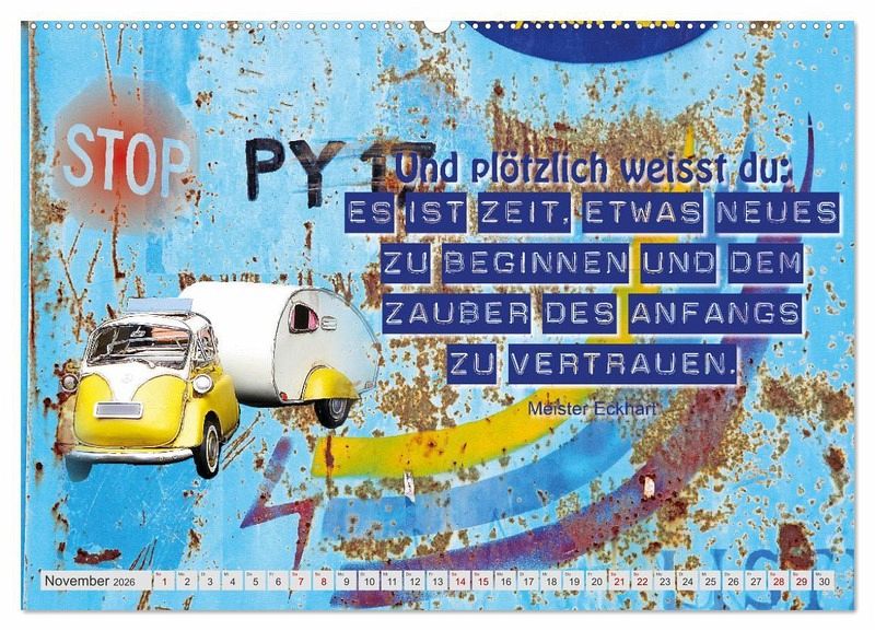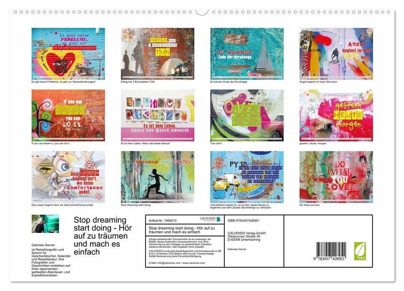 Die schön gestalteten Kalenderseiten mit den motivierenden und coolen Sprüchen regen jeden Tag aufs Neue zum Nachdenken an. Die tolle, individuelle Gestaltung in fröhlichen, kräftigen Farben mit Collagen und Motiven aus aller Welt hebt die Laune beim Betrachten deutlich. Für sich selbst oder als prima Geschenk für Menschen, die die sich gerne motivieren lassen und vorwärtskommen.