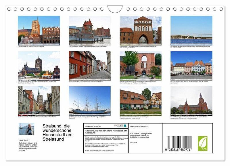 Stralsund wird aufgrund seiner Lage am Strelasund, der Meerenge zwischen dem Festland und der Insel Rügen, auch als Tor zu dieser größten deutschen Insel bezeichnet. Die nach der Wende wunderschön restaurierte Altstadt ist als Weltkulturerbe anerkannt. Darüber hinaus prägen mittelalterliche Kirchen, ein einzigartiges Rathaus, aber auch das berühmte Ozeaneum, ein Meeresmuseum der Superlative, sowie die erste, 1933 erbaute "Gorch Fock", die Stadt. Lassen Sie sich von den außergewöhnlichen Fotos des Kalenders über Stralsunds Sehenswürdigkeiten inspirieren.