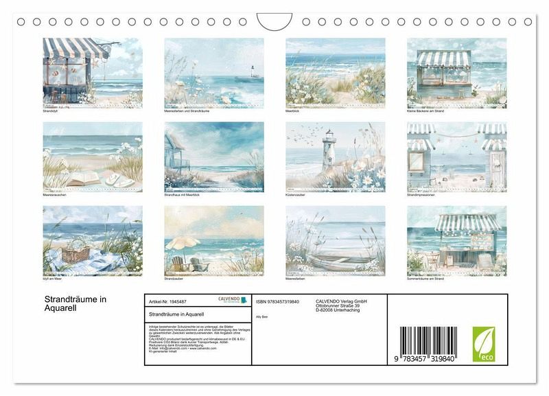 Entdecken Sie den KI Kalender "Strandträume in Aquarell" - Ihr perfekter Begleiter für das ganze Jahr! Unsere einzigartigen Aquarellbilder fangen die idyllische Schönheit von Strandmotiven ein und bringen die Ruhe und Magie der Küste direkt in Ihr Zuhause. Ideal für Meerliebhaber und Sommerenthusiasten, die sich nach einem Hauch von Urlaub sehnen. Gönnen Sie sich oder Ihren Liebsten diesen hochwertigen Kalender und genießen Sie jeden Monat ein neues, wunderschönes Bild. Jetzt kaufen und das ganze Jahr über Strandfeeling erleben!