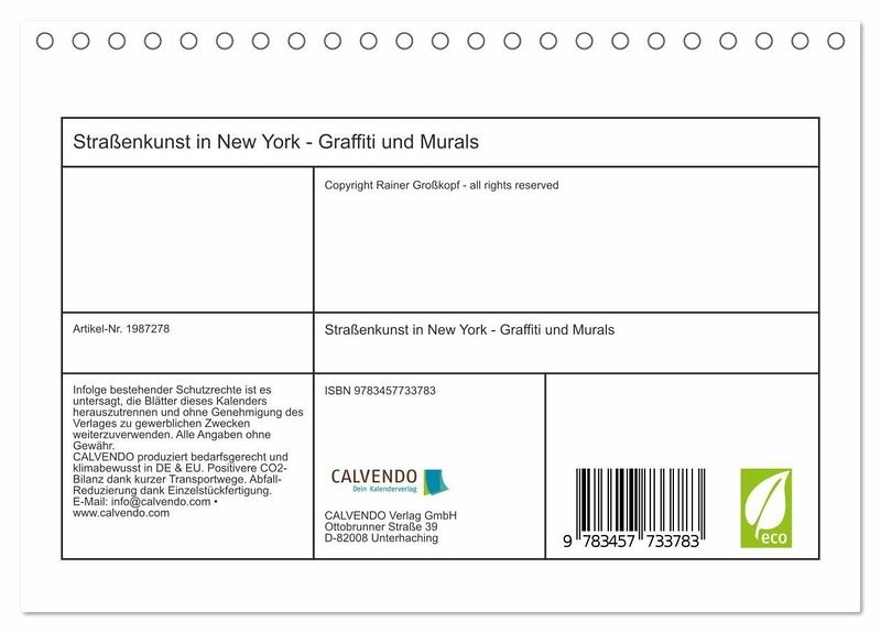 QUALITÄT - Hochwertiger Fotokalender mit 12 wunderschönen Motiven auf lichtbeständigem Bilderdruckpapier, robuste Spiralbindung.NACHHALTIG - deutliche Abfallreduzierung durch bedarfsgerechte Einzelstückfertigung, umweltfreundliches FSC-zertifiziertes Papier, Produktion in Deutschland, klimabewusste Logistik.PERFEKTES GESCHENK - Kalender für Freunde und Familie, für Kinder undErwachsene, jung und alt, zu Weihnachten, Geburtstag oder zwischendurch.VIELFALT - Bildkalender in verschiedenen Formaten, z.B. DIN A5, DIN A4, DIN A3 sowie DIN A2. Ob Naturmotiv, Gemälde oder Fotos, ideal für ein persönliches Wohlfühlambiente.Street Art aus verschiedensten Statdtteilen New Yorks von Autor(in): gro
