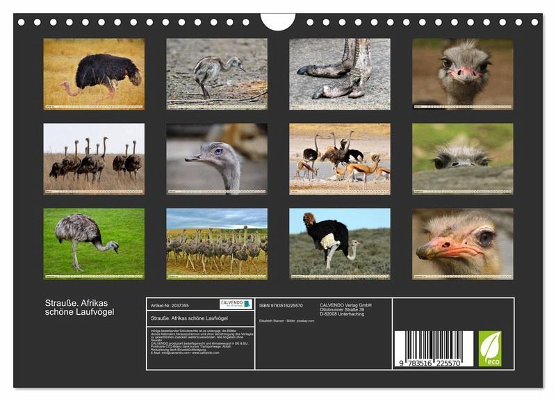QUALITÄT - Hochwertiger Fotokalender mit 12 wunderschönen Motiven auf lichtbeständigem Bilderdruckpapier, robuste Spiralbindung mit Aufhängebügel.NACHHALTIG - deutliche Abfallreduzierung durch bedarfsgerechte Einzelstückfertigung, umweltfreundliches FSC-zertifiziertes Papier, Produktion in Deutschland, klimabewusste Logistik.PERFEKTES GESCHENK - Kalender für Freunde und Familie, für Kinder und Erwachsene, jung und alt, zu Weihnachten, Geburtstag oder zwischendurch.VIELFALT - Bildkalender in verschiedenen Formaten, z.B. DIN A5, DIN A4, DIN A3 sowie DIN A2. Ob Naturmotiv, Gemälde oder Fotos, ideal für ein persönliches Wohlfühlambiente.Der größte Laufvogel der Erde aus der Nähe betrachtet von Autor(in): Elisabeth Stanzer