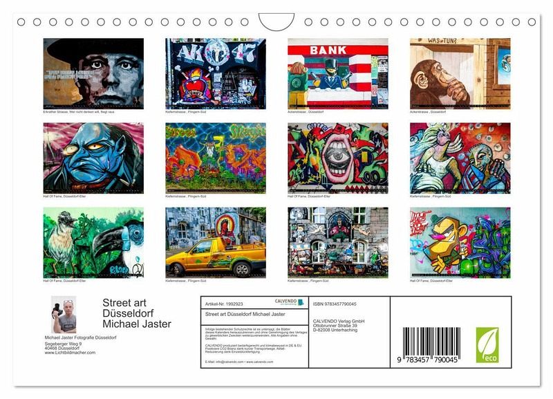 Street-Art, ist nichtkommerzielle zeitgenössische Kunst, die im öffentlichen Raum sichtbar ist. Die Werke entstehen sehr häufig illegal und anonym. Gestaltet werden von den Machern der Kunst, Flächen wie Wände, Maueren, Schilder, Stromverteilerkästen, Laternen, Verkehrsschilder, Telefonzellen, Mülleimer und andere Dinge im Urbanen Umfeld. Mein Kalender zeigt Fotografien aus der Kunstrichtung Street-Art in Düsseldorf. Bilder aus der Hall Of Fame in Düsseldorf-Eller zeigen Graffiti in kraftvollen Farben und beeindruckender Grösse der Düsseldorfer Graffiti Künstler.