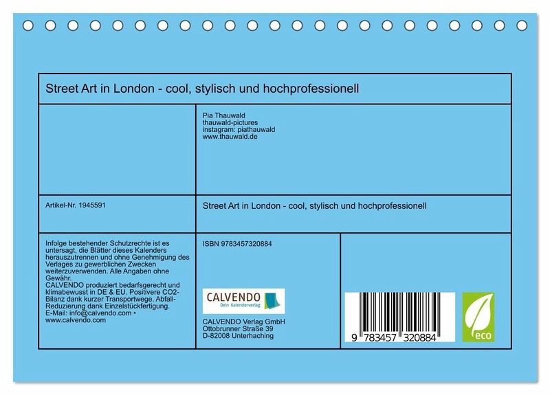 QUALITÄT - Hochwertiger Fotokalender mit 12 wunderschönen Motiven auf lichtbeständigem Bilderdruckpapier, robuste Spiralbindung.NACHHALTIG - deutliche Abfallreduzierung durch bedarfsgerechte Einzelstückfertigung, umweltfreundliches FSC-zertifiziertes Papier, Produktion in Deutschland, klimabewusste Logistik.PERFEKTES GESCHENK - Kalender für Freunde und Familie, für Kinder und Erwachsene, jung und alt, zu Weihnachten, Geburtstag oder zwischendurch.VIELFALT - Bildkalender in verschiedenen Formaten, z.B. DIN A5, DIN A4, DIN A3 sowie DIN A2. Ob Naturmotiv, Gemälde oder Fotos, ideal für ein persönliches Wohlfühlambiente.Bunt, vielfältig, plakativ und hochprofessionell - Street Art in London ist ein Eldorado für Liebhaber und Künstler der Szene von Autor(in): Pia Thauwald