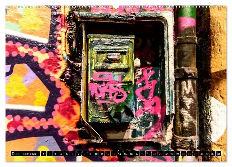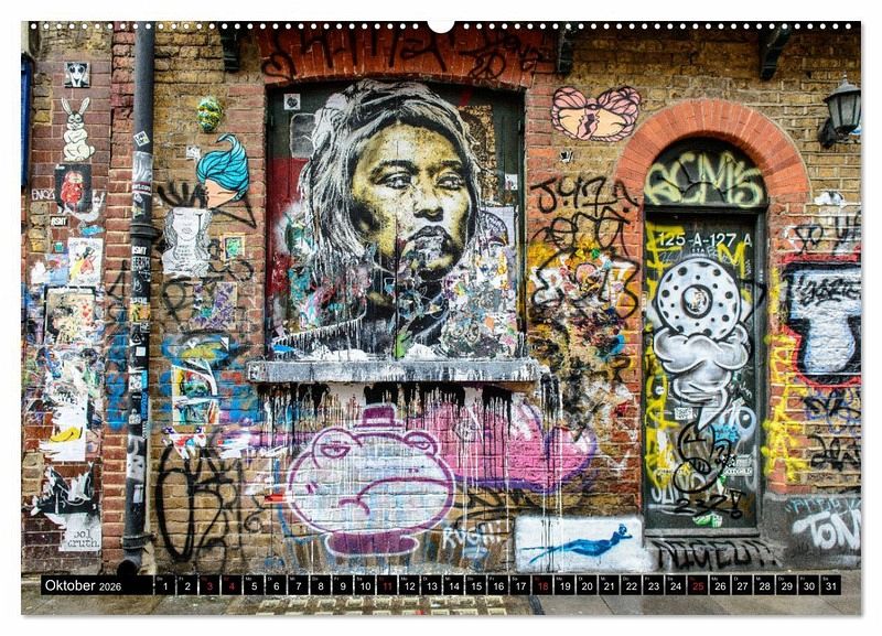 Street-Art, ist nichtkommerzielle zeitgenössische Kunst, die im öffentlichen Raum sichtbar ist. Die Werke entstehen sehr häufig illegal und anonym. Gestaltet werden von den Machern der Kunst, Flächen wie Wände, Maueren, Schilder, Stromverteilerkästen, Laternen, Verkehrsschilder, Telefonzellen, Mülleimer und andere Dinge im Urbanen Umfeld. Mein Kalender zeigt Fotografien aus der Kunstrichtung Street-Art in London. Bilder aus dem Leake Street Tunnel zeigen Graffiti in kraftvollen Farben und beeindruckender Grösse der Londoner Graffiti Künstler.