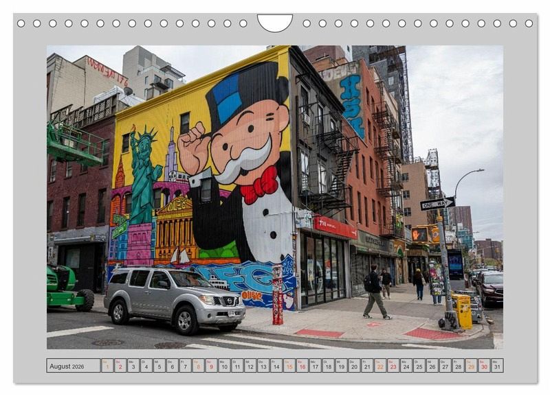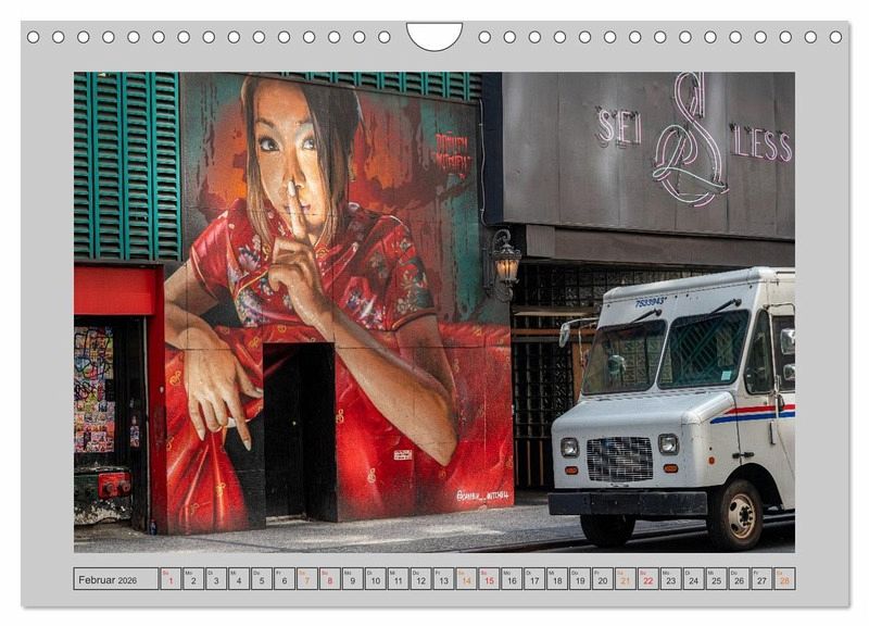 In New York wird Kunst nicht nur in Galerien gezeigt, sondern sie ist auch auf Wänden, Häuserfassaden und Straßenecken zu finden. Dieser Kalender präsentiert beeindruckende Aufnahmen weltberühmter Murals und Graffitis, die das Stadtbild prägen.