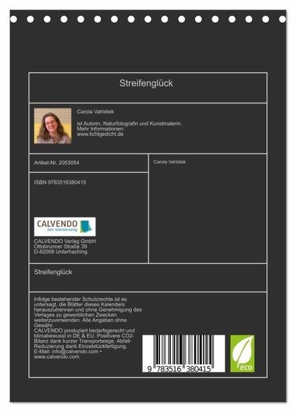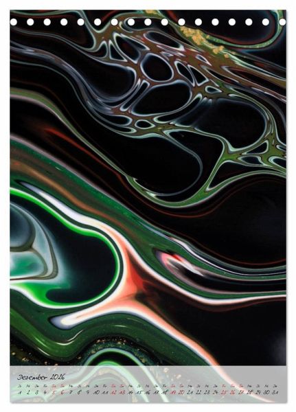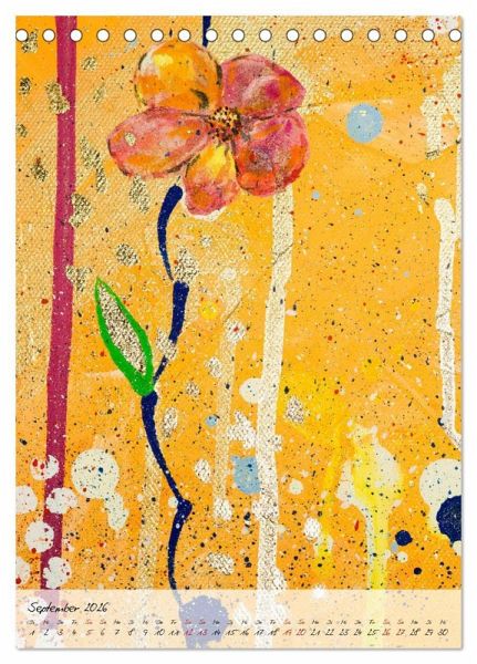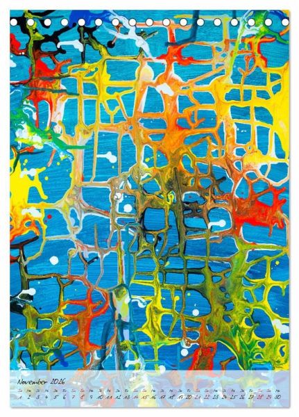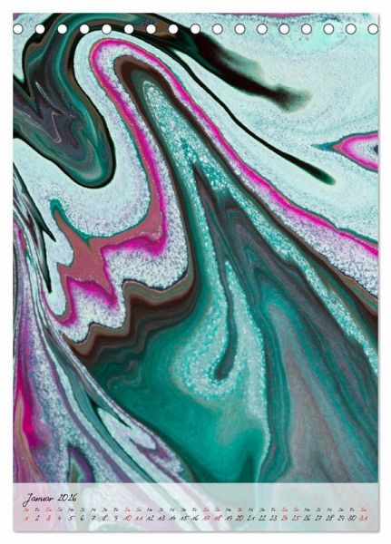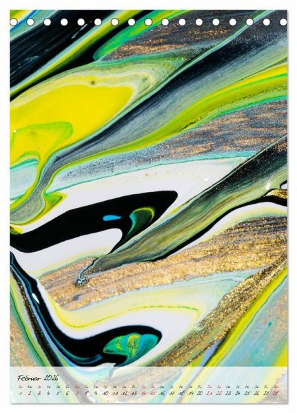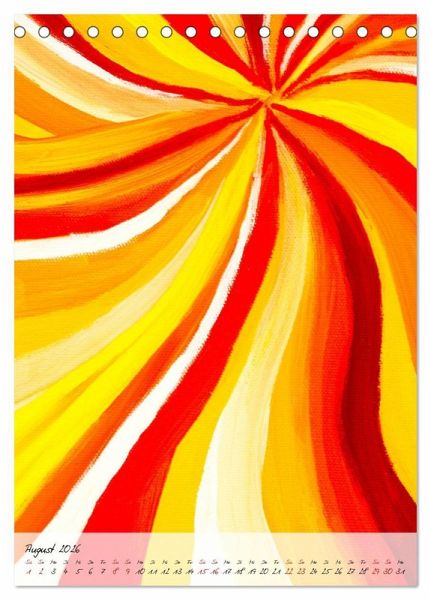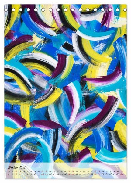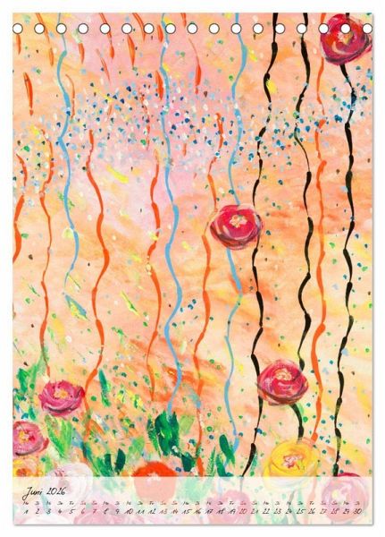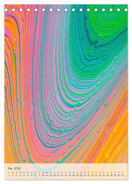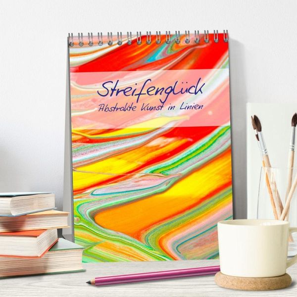 Mit verschiedenen Techniken und Malstilen, unter anderem mit Acrylic Pouring (zu deutsch etwa "Acryl gießen") hat die Künstlerin Carola Vahldiek einzigartige, farbenprächtige Malereien geschaffen, die auf verschiedene, immer wieder überraschende, stets ästethisch ansprechende Art und Weise das Thema Streifen und Linien aufgreifen. Die bunten, mal geraden, mal geschwungenen, mal feineren und mal kräftigeren Streifenmuster auf den Ausschnitten Ihrer Gemälde machen jedes Kalenderblatt zu einem echten Hingucker und einer wunderschönen Wanddekoration. Die harmonische Farbwahl schmeichelt Auge und Seele und bringt Freude und Inspiration in Ihre Wohnung, Ihr Büro und jedes andere Zimmer. Schicken Sie Ihre Kreativität und Ihre die Augen auf eine freudige Abenteuerreise. Jeden Tag neu.