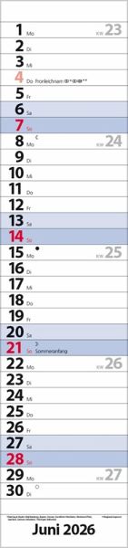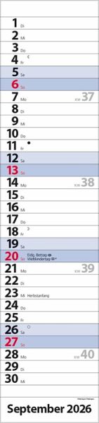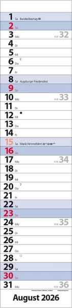 Attraktiver Streifenplaner in kompaktem Format mit Spiralbindung und Feiertagen für D/A/CH. Die Wochenenden sind blau hervorgehoben. Kalendarium in deutscher Sprache.