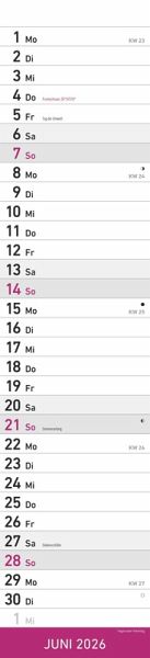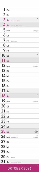 Dank des kompakten Formats von 11,3 x 49,5 cm passt der Kalender auch in kleine Nischen, bietet jedoch ausreichend Platz für Eintragungen im großzügigen Kalendarium. Das deutschsprachige Kalendarium enthält alle Feiertage für Deutschland, Österreich und die Schweiz sowie die Mondphasen.