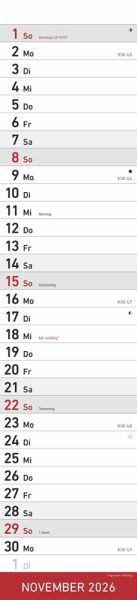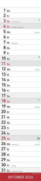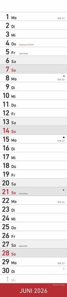 Das kompakte Format von 11,3 x 49,5 cm macht den Kalender besonders platzsparend, ohne auf Übersichtlichkeit zu verzichten. Das deutschsprachige Kalendarium bietet ausreichend Platz für Eintragungen und enthält Feiertage für Deutschland, Österreich und die Schweiz sowie die Mondphasen.