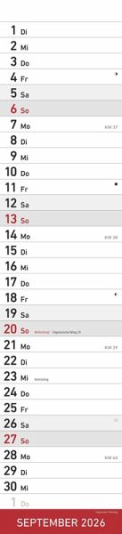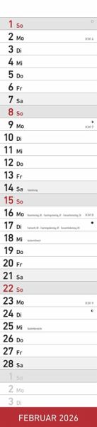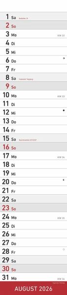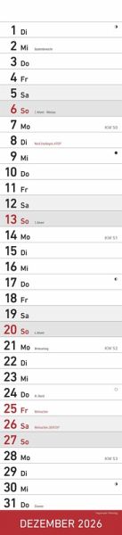 Streifenkalender im platzsparenden Format 11,3 x 49,5 cm ideal für kleine und große Räume Kräftiges Rot-Design funktional und dekorativ zugleich Für Familien, Paare, Singles & Berufstätige geeignet FSC-zertifiziertes Papier aus nachhaltiger Forstwirtschaft Deutsches Kalendarium mit Feiertagen (DE/AT/CH) & Mondphasen Stabile Spiralbindung mit Aufhängevorrichtung für bequemes Umblättern Viel Platz für Termine, Notizen & persönliche Planungen Perfekt als praktisches Geschenk für eine klare Jahresorganisation