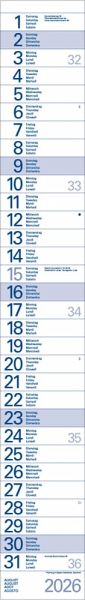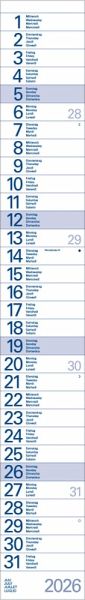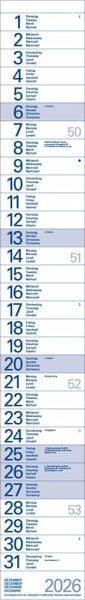 Praktischer Streifentimer mit Spiralbindung und Datumsschieber. Sonn- und Feiertage blau markiert. Kalendarium d-e-f-i.