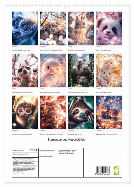 Lass dich von den zauberhaftesten Tierbabys verzaubern! Diese kleinen Wesen mit ihren flauschigen Fellchen, zarten Stupsnasen und großen, neugierigen Augen haben nur eines im Sinn: dein Herz erobern. In jeder Seite dieses bezaubernden Bildbandes blicken die kleinen Tiere direkt in die Kamera - und tief in deine Seele. Ihre Kuschelblicke und unschuldigen Gesichter werden dich zum Schmelzen bringen und dir ein Lächeln ins Gesicht zaubern. Perfekt für alle Tierfreunde, die die süßesten Momente der Natur genießen möchten. Gönn dir eine Auszeit voller Wärme und Liebe mit diesem Kalender. Alle hier gezeigten Bilder wurden mit Sorgfalt, Liebe und mit Hilfe einer KI generiert. Abschließend werden sie mit Bildbearbeitungsprogrammen überarbeitet und in den Kalender eingefügt.