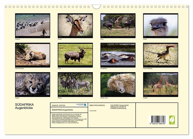 QUALITÄT - Hochwertiger Fotokalender mit 12 wunderschönen Motiven auf lichtbeständigem Bilderdruckpapier, robuste Spiralbindung mit Aufhängebügel.NACHHALTIG - deutliche Abfallreduzierung durch bedarfsgerechte Einzelstückfertigung, umweltfreundliches FSC-zertifiziertes Papier, Produktion in Deutschland, klimabewusste Logistik.PERFEKTES GESCHENK - Kalender für Freunde und Familie, für Kinder und Erwachsene, jung und alt, zu Weihnachten, Geburtstag oder zwischendurch.VIELFALT - Bildkalender in verschiedenen Formaten, z.B. DIN A5, DIN A4, DIN A3 sowie DIN A2. Ob Naturmotiv, Gemälde oder Fotos, ideal für ein persönliches Wohlfühlambiente.Südafrika - Faszination Safari von Autor(in): U boeTtchEr