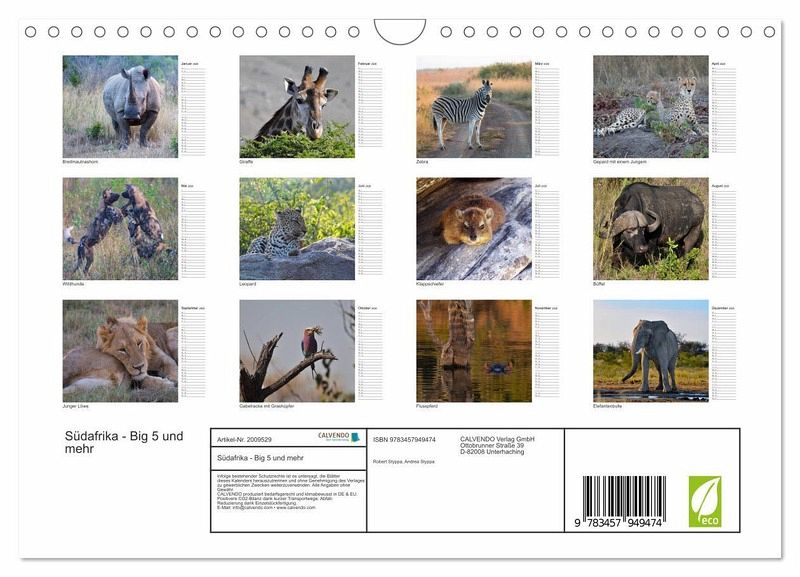 QUALITÄT - Hochwertiger Fotokalender mit 12 wunderschönen Motiven auf lichtbeständigem Bilderdruckpapier, robuste Spiralbindung mit Aufhängebügel.NACHHALTIG - deutliche Abfallreduzierung durch bedarfsgerechte Einzelstückfertigung, umweltfreundliches FSC-zertifiziertes Papier, Produktion in Deutschland, klimabewusste Logistik.PERFEKTES GESCHENK - Kalender für Freunde und Familie, für Kinder und Erwachsene, jung und alt, zu Weihnachten, Geburtstag oder zwischendurch.VIELFALT - Bildkalender in verschiedenen Formaten, z.B. DIN A5, DIN A4, DIN A3 sowie DIN A2. Ob Naturmotiv, Gemälde oder Fotos, ideal für ein persönliches Wohlfühlambiente.Faszinierende Fotos von Büffel, Leopard, Löwe, Nashorn, Elefant und anderen. von Autor(in): ROBERT STYPPA