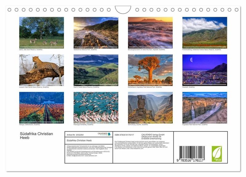 Grandiose Südafrikanische Landschaften und Tiere von Christian Heeb. Von Kapstadt und den Weingütern über die Wilde Küste von Tsitsikamma bis zu den Tieren in Sabi Sands Reserve. Dieser Kalender gehört zu den CALVENDO-Topsellern!