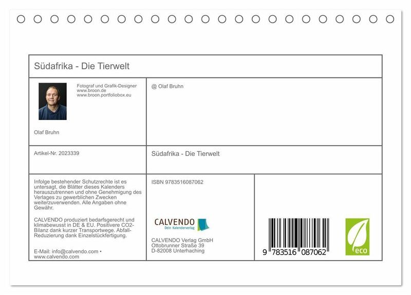 QUALITÄT - Hochwertiger Fotokalender mit 12 wunderschönen Motiven auf lichtbeständigem Bilderdruckpapier, robuste Spiralbindung.NACHHALTIG - deutliche Abfallreduzierung durch bedarfsgerechte Einzelstückfertigung, umweltfreundliches FSC-zertifiziertes Papier, Produktion in Deutschland, klimabewusste Logistik.PERFEKTES GESCHENK - Kalender für Freunde und Familie, für Kinder und Erwachsene, jung und alt, zu Weihnachten, Geburtstag oder zwischendurch.VIELFALT - Bildkalender in verschiedenen Formaten, z.B. DIN A5, DIN A4, DIN A3 sowie DIN A2.Ob Naturmotiv, Gemälde oder Fotos, ideal für ein persönliches Wohlfühlambiente.12 wunderschöne Tieraufnahmen aus Südafrika von dem Fotografen und Grafik-Designer Olaf Bruhn von Autor(in): Olaf Bruhn