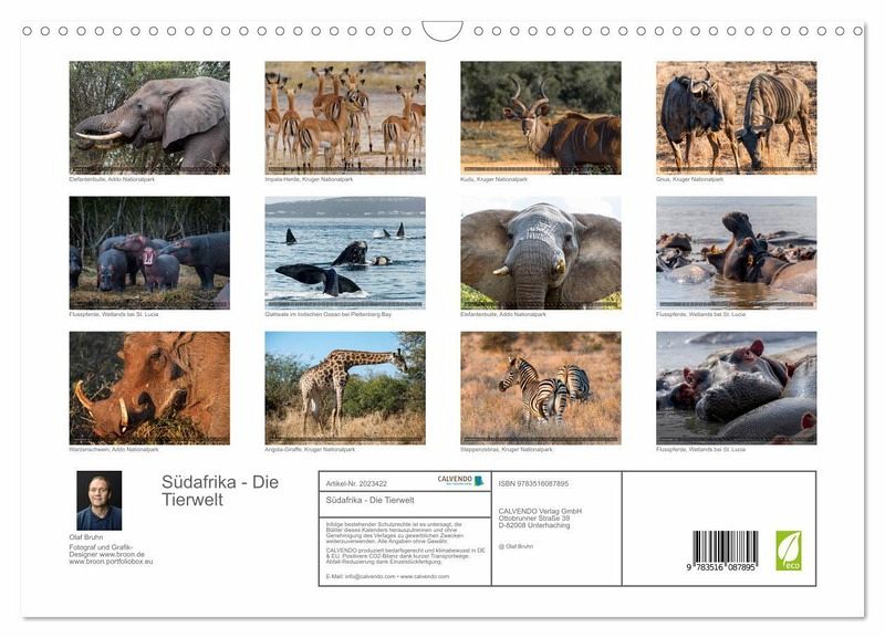 QUALITÄT - Hochwertiger Fotokalender mit 12 wunderschönen Motiven auf lichtbeständigem Bilderdruckpapier, robuste Spiralbindung mit Aufhängebügel.NACHHALTIG - deutliche Abfallreduzierung durch bedarfsgerechte Einzelstückfertigung, umweltfreundliches FSC-zertifiziertes Papier, Produktion in Deutschland, klimabewusste Logistik.PERFEKTES GESCHENK - Kalender für Freunde und Familie, für Kinder und Erwachsene, jung und alt, zu Weihnachten, Geburtstag oder zwischendurch.VIELFALT - Bildkalender in verschiedenen Formaten, z.B. DIN A5, DIN A4, DIN A3 sowie DIN A2. Ob Naturmotiv,Gemälde oder Fotos, ideal für ein persönliches Wohlfühlambiente.12 wunderschöne Tieraufnahmen aus Südafrika von dem Fotografen und Grafik-Designer Olaf Bruhn von Autor(in): Olaf Bruhn