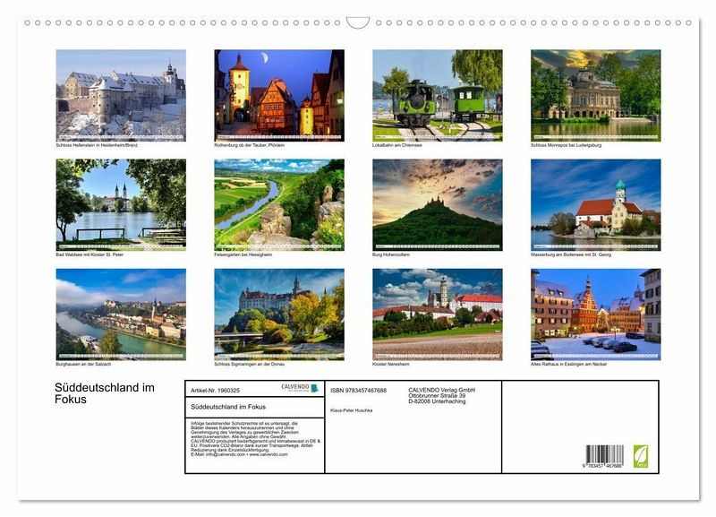 QUALITÄT - Hochwertiger Fotokalender mit 12 wunderschönen Motiven auf lichtbeständigem Bilderdruckpapier, robuste Spiralbindung mit Aufhängebügel.NACHHALTIG - deutliche Abfallreduzierung durch bedarfsgerechte Einzelstückfertigung, umweltfreundliches FSC-zertifiziertes Papier, Produktion in Deutschland, klimabewusste Logistik.PERFEKTES GESCHENK - Kalender für Freunde und Familie, für Kinder und Erwachsene, jung und alt, zu Weihnachten, Geburtstag oder zwischendurch.VIELFALT - Bildkalender in verschiedenen Formaten, z.B. DIN A5, DIN A4, DIN A3 sowie DIN A2. Ob Naturmotiv, Gemälde oder Fotos, ideal für ein persönliches Wohlfühlambiente.Highlights aus Deutschlands Süden von Autor(in): Peter Huschka