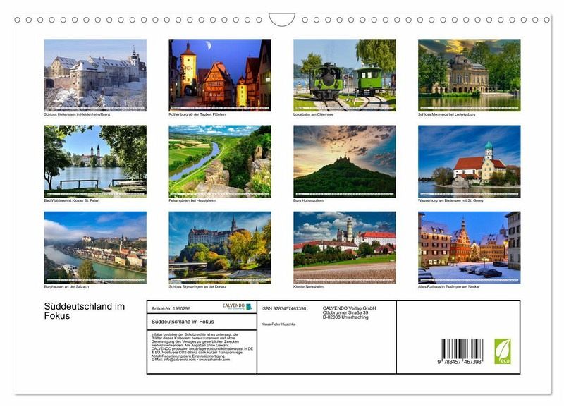 QUALITÄT - Hochwertiger Fotokalender mit 12 wunderschönen Motiven auf lichtbeständigem Bilderdruckpapier, robuste Spiralbindung mit Aufhängebügel.NACHHALTIG - deutliche Abfallreduzierung durch bedarfsgerechte Einzelstückfertigung, umweltfreundliches FSC-zertifiziertes Papier, Produktion in Deutschland, klimabewusste Logistik.PERFEKTES GESCHENK - Kalender für Freunde und Familie, für Kinder und Erwachsene, jung und alt, zu Weihnachten, Geburtstag oder zwischendurch.VIELFALT - Bildkalender in verschiedenen Formaten, z.B. DIN A5, DIN A4, DIN A3 sowie DIN A2. Ob Naturmotiv, Gemälde oder Fotos, ideal für ein persönliches Wohlfühlambiente.Highlights aus Deutschlands Süden von Autor(in): Peter Huschka