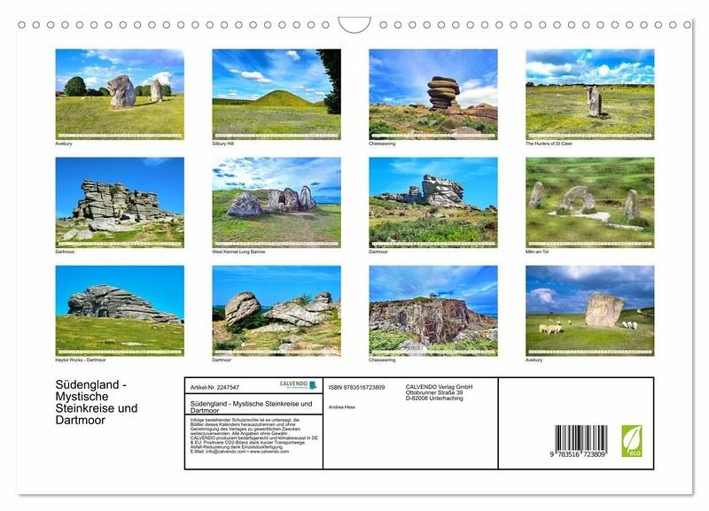 Von den ehrwürdigen Kreisen in Avebury bis zu den geheimnisvollen Formationen von Dartmoor, Cheesewrings und den stillen Rhapsodien von Silbury Hill und West Kennet Long Barrow führt dieser Kalender durch eine Welt uralter Steinformationen und poetischer Landschaften. Jede Seite erzählt eine Geschichte aus der Vergangenheit, eingefangen in atemberaubender Fotografie und verlässlichem Kalendarium für Termine, Ferien und Inspiration. Tauchen Sie ein in eine Welt aus Geschichte, Archäologie und naturgewaltiger Schönheit - jeden Monat ein neues Kapitel Südenglands.