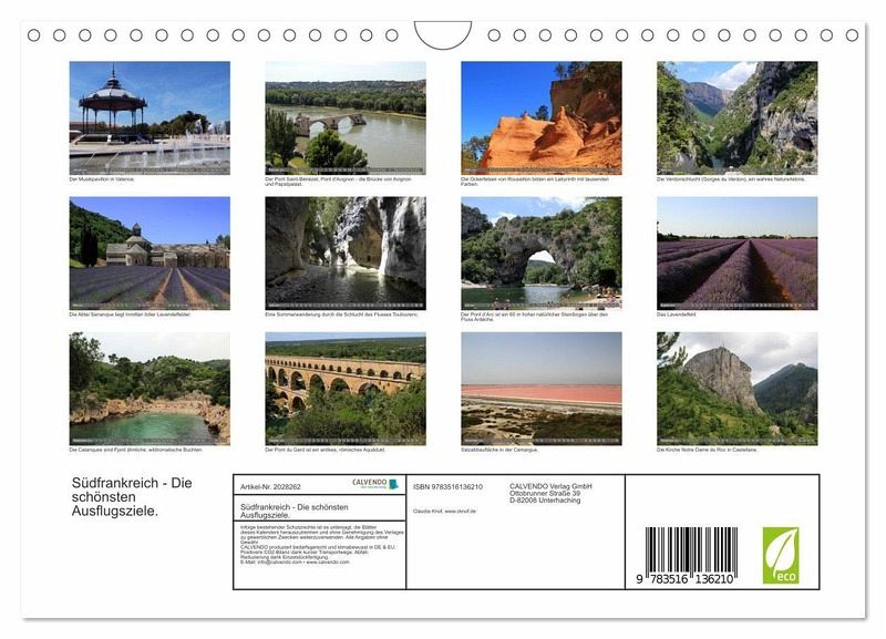 QUALITÄT - Hochwertiger Fotokalender mit 12 wunderschönen Motiven auf lichtbeständigem Bilderdruckpapier, robuste Spiralbindung mit Aufhängebügel.NACHHALTIG - deutliche Abfallreduzierung durch bedarfsgerechte Einzelstückfertigung, umweltfreundliches FSC-zertifiziertes Papier, Produktion in Deutschland, klimabewusste Logistik.PERFEKTES GESCHENK - Kalender für Freunde und Familie, für Kinder und Erwachsene, jung und alt, zu Weihnachten, Geburtstag oder zwischendurch.VIELFALT - Bildkalender in verschiedenen Formaten, z.B. DIN A5, DIN A4, DIN A3 sowie DIN A2. Ob Naturmotiv, Gemälde oder Fotos, ideal für ein persönliches Wohlfühlambiente.Ausflugsziele in Südfrankreich von Autor(in): Claudia Knof-Hartmann