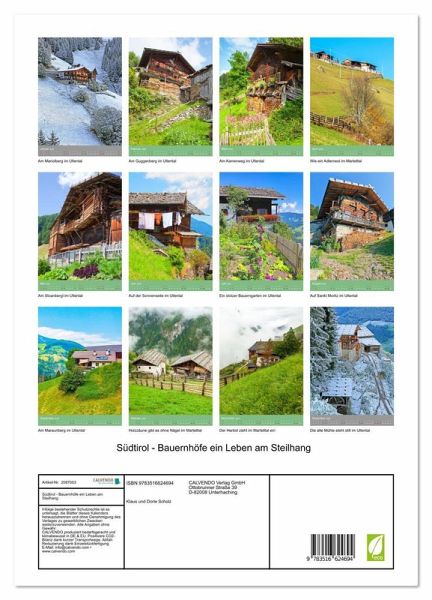 PREMIUM-LINIE - Brillanter Fotokalender mit 12 wunderschönen Motiven, Kunstdruck in Hochglanz in Museumsqualität.QUALITÄT - edle Materialien, stabile Rückwand mit 2 innovativen Einstecktaschen für eine optimale Präsentation an der Wand.NACHHALTIG - deutliche Abfallreduzierung durch bedarfsgerechte Einzelstückfertigung, umweltfreundliches FSC-zertifiziertes Papier, Produktion in Deutschland, klimabewusste Logistik.PERFEKTES GESCHENK - Kalender für Freunde und Familie, für Kinder und Erwachsene, jung und alt, zu Weihnachten, Geburtstag oder zwischendurch.Die Menschen in den Tälern Südtirols haben sich an steilen Berghängen angesiedelt, weil diese Lage oft Schutz vor Hochwasser und Feinden bot. von Autor(in): Klaus Scholz