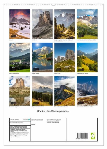 Dieser Kalender wird alle Naturliebhaber und Wanderfreudige begeistern. Die Fotos wurden auf der Seiser Alm, den Pragser Wildsee, dem Naturpark drei Zinnen, auf dem Secada, etc. aufgenommen. Er eignet sich natürlich als Geschenk für alle Berg- und Naturliebhaber.