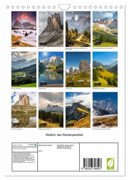 Dieser Kalender wird alle Naturliebhaber und Wanderfreudige begeistern. Die Fotos wurden auf der Seiser Alm, den Pragser Wildsee, dem Naturpark drei Zinnen, auf dem Secada, etc. aufgenommen. Er eignet sich natürlich als Geschenk für alle Berg- und Naturliebhaber.