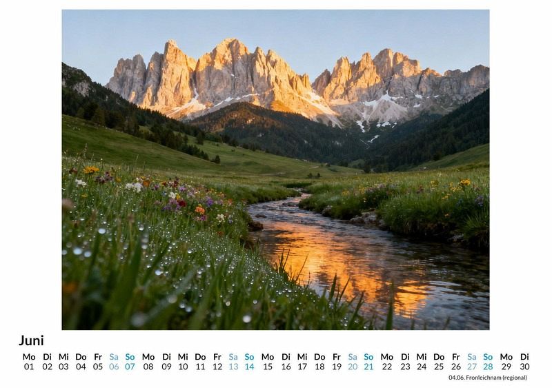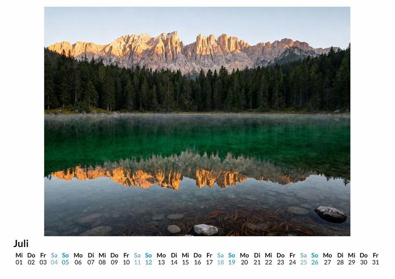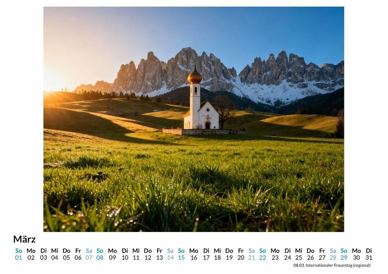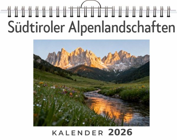 Wo schroffe Felsgipfel den Himmel berühren und sanfte Almwiesen in der Sonne leuchten, entfaltet Südtirol seine ganze Pracht. Der Kalender "Südtiroler Alpenlandschaften" fängt diese besonderen Momente ein und begleitet durch das Jahr mit eindrucksvollen Landschaftsbildern. Dieser Kalender ist eine gute Wahl: Für Liebhaber der Südtiroler Bergwelt. Für alle, die eine stilvolle Wanddekoration mit Naturmotiven suchen. Als Geschenkidee für Freunde von Bergpanoramen und alpiner Natur. Zwölf Monatsblätter zeigen charakteristische Szenen, von den markanten Drei Zinnen bis zu idyllischen Tälern mit blühenden Apfelbäumen. Jede Ansicht wurde sorgfältig aus unzähligen digitalen Datenpunkten komponiert, um eine idealisierte Vision der alpinen Schönheit zu erschaffen. Die Motive präsentieren die Region in wechselnden Lichtstimmungen und Jahreszeiten, von schneebedeckten Gipfeln im Winter bis zu satten grünen Hängen im Sommer. Jedes Bild erzählt eine eigene kleine Geschichte von der Kraft und Ruhe der Natur. Was der Kalender bietet: Zwölf ausgewählte Monatsmotive aus der Alpenregion. Ein praktisches Kalendarium für die monatliche Terminübersicht. Einen Wandkalender, der das ganze Jahr über alpine Stimmung verbreitet. Dieser Kalender ist eine Hommage an die vielfältige Landschaft Südtirols. Eine Einladung, die Faszination der Berge Monat für Monat neu zu entdecken. Ein Blick auf die Monatsansichten offenbart die Vielfalt der Motive.