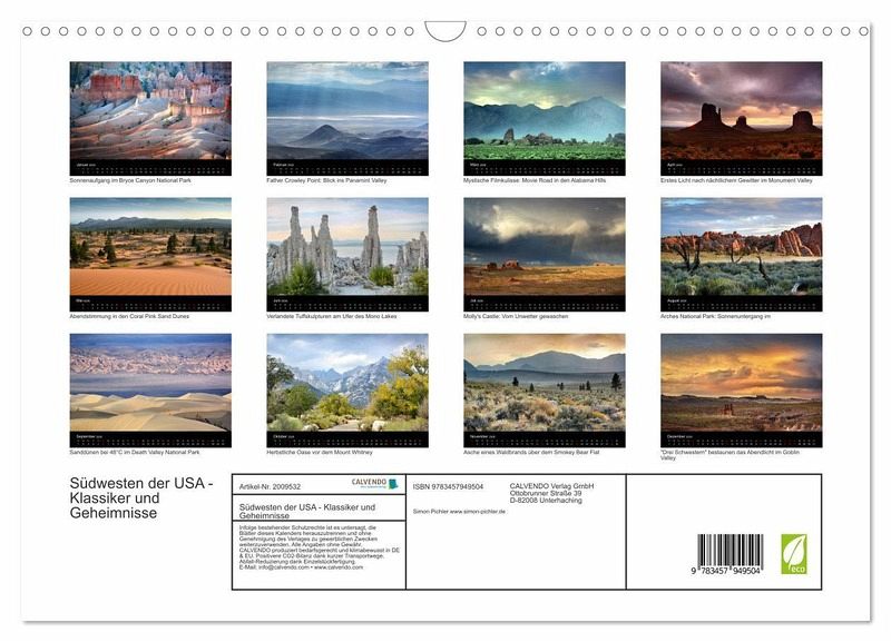 QUALITÄT - Hochwertiger Fotokalender mit 12 wunderschönen Motiven auf lichtbeständigem Bilderdruckpapier, robuste Spiralbindung mit Aufhängebügel.NACHHALTIG - deutliche Abfallreduzierung durch bedarfsgerechte Einzelstückfertigung, umweltfreundliches FSC-zertifiziertes Papier, Produktion in Deutschland, klimabewusste Logistik.PERFEKTES GESCHENK - Kalender für Freunde und Familie, für Kinder und Erwachsene, jung und alt, zu Weihnachten, Geburtstag oder zwischendurch.VIELFALT - Bildkalender in verschiedenen Formaten, z.B. DIN A5, DIN A4, DIN A3 sowie DIN A2. Ob Naturmotiv, Gemälde oder Fotos, ideal für ein persönliches Wohlfühlambiente.Ein geheimnisvoller Ausflug in den Südwesten der USA von Autor(in): Simon Pichler