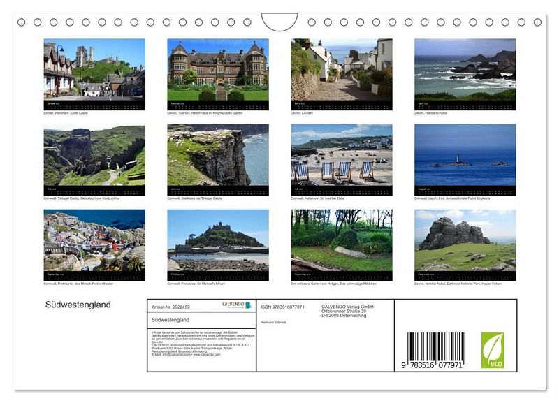 QUALITÄT - Hochwertiger Fotokalender mit 12 wunderschönen Motiven auf lichtbeständigem Bilderdruckpapier, robuste Spiralbindung mit Aufhängebügel.NACHHALTIG - deutliche Abfallreduzierung durch bedarfsgerechte Einzelstückfertigung, umweltfreundliches FSC-zertifiziertes Papier, Produktion in Deutschland, klimabewusste Logistik.PERFEKTES GESCHENK - Kalender für Freunde und Familie, für Kinder und Erwachsene, jung und alt, zu Weihnachten, Geburtstag oder zwischendurch.VIELFALT - Bildkalender in verschiedenen Formaten, z.B. DIN A5, DIN A4, DIN A3 sowie DIN A2. Ob Naturmotiv, Gemälde oder Fotos, ideal für ein persönliches Wohlfühlambiente.Eine Reise durch Südwestengland von Autor(in): Reinhard Schmidt