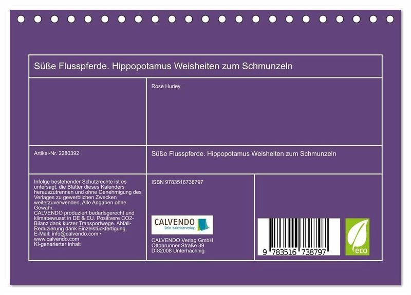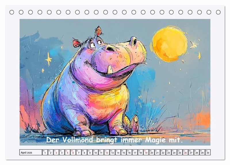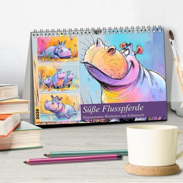 Dieser Kalender zeigt das sanfte Leben am Wasser - charmante Flusspferde, die zwischen Lachen und Loslassen das Glück finden. Die niedlichen Cartoons fangen die gemütliche Seele dieser Tiere ein: mal träumend, mal planschend, immer voller Herz. Jedes Motiv wurde mit der Hilfe von KI erstellt und bringt eine kleine Portion Weisheit mit, die dich zum Schmunzeln und Nachdenken einlädt. Ein Kalender, der dich erinnert: Das Leben darf auch mal langsam, leicht und lustig sein.