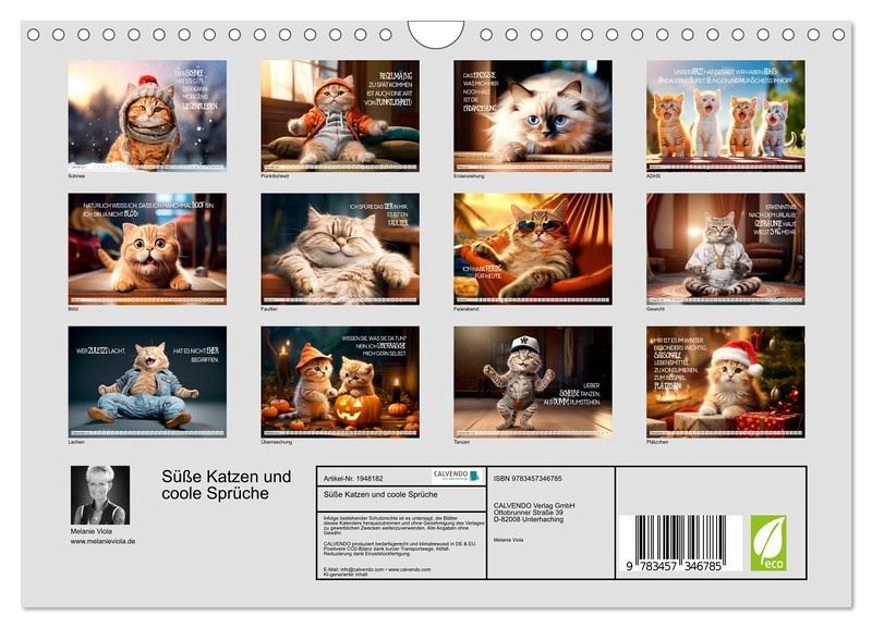 Entdecken Sie unsere niedlichen Stubentiger mit menschlichen Eigenschaften in den unterschiedlichsten Situationen. 12 lustige Aussagen versüßen das Jahr. Sicherlich finden Sie sich auch in dem einen oder anderen Thema wieder. Die Motive wurden in Zusammenarbeit mit künstlicher Intelligenz und ohne Tierleid erschaffen.