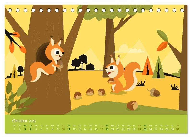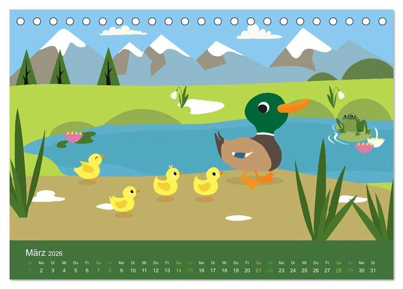 Liebenswerte Tiere begleiten die Kinder durch das Jahr. Viele heimische Tiere wie Fuchs, Vögel, Rehe, Enten und Eichhörnchen sorgen für Spaß und Freude. Passend zu den Monaten, in bunten Bildern. Ideal für Kitas und Kindergärten, oder für Familien als Dekoration im Kinderzimmer.