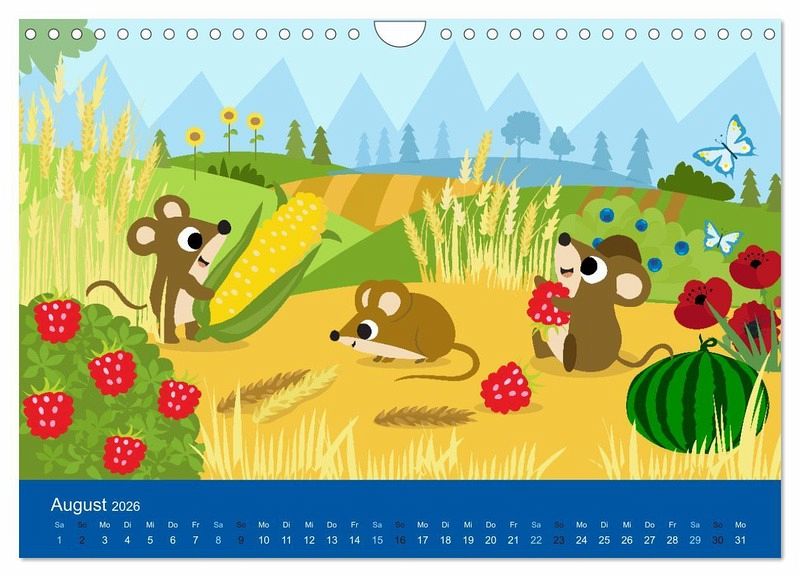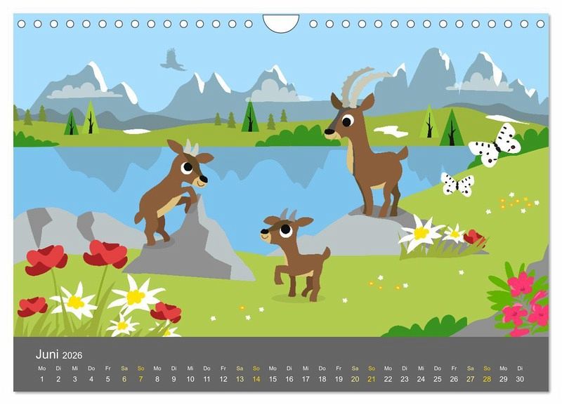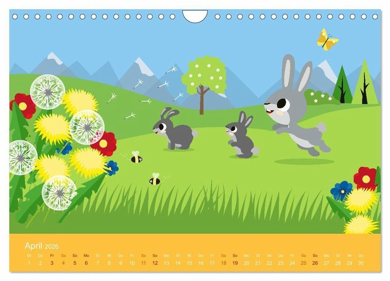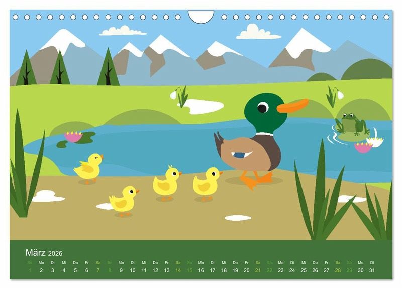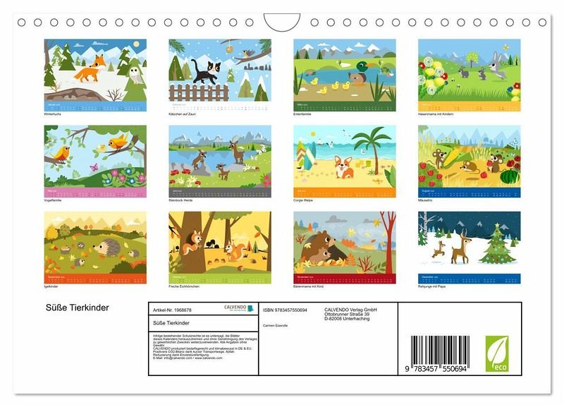 Liebenswerte Tiere begleiten die Kinder durch das Jahr. Viele heimische Tiere wie Fuchs, Vögel, Rehe, Enten und Eichhörnchen sorgen für Spaß und Freude. Passend zu den Monaten, in bunten Bildern. Ideal für Kitas und Kindergärten, oder für Familien als Dekoration im Kinderzimmer.