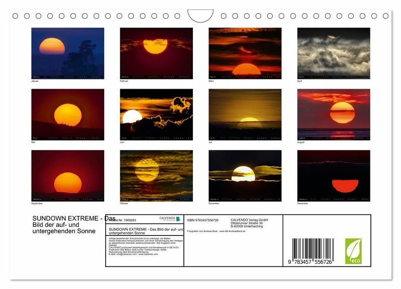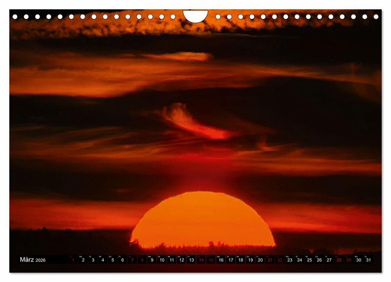 QUALITÄT - Hochwertiger Fotokalender mit 12 wunderschönen Motiven auf lichtbeständigem Bilderdruckpapier, robuste Spiralbindung mit Aufhängebügel.NACHHALTIG - deutliche Abfallreduzierung durch bedarfsgerechte Einzelstückfertigung, umweltfreundliches FSC-zertifiziertes Papier, Produktion in Deutschland, klimabewusste Logistik.PERFEKTES GESCHENK - Kalender für Freunde und Familie, für Kinder und Erwachsene, jung und alt, zu Weihnachten, Geburtstag oder zwischendurch.VIELFALT - Bildkalender in verschiedenen Formaten, z.B. DIN A5, DIN A4, DIN A3 sowie DIN A2. Ob Naturmotiv, Gemälde oder Fotos, ideal für ein persönliches Wohlfühlambiente.Kurz nach Sonnenaufgang und vor Sonnenuntergang präsentiert sich die Sonne in glänzender Pracht. von Autor(in): Andreas Beck